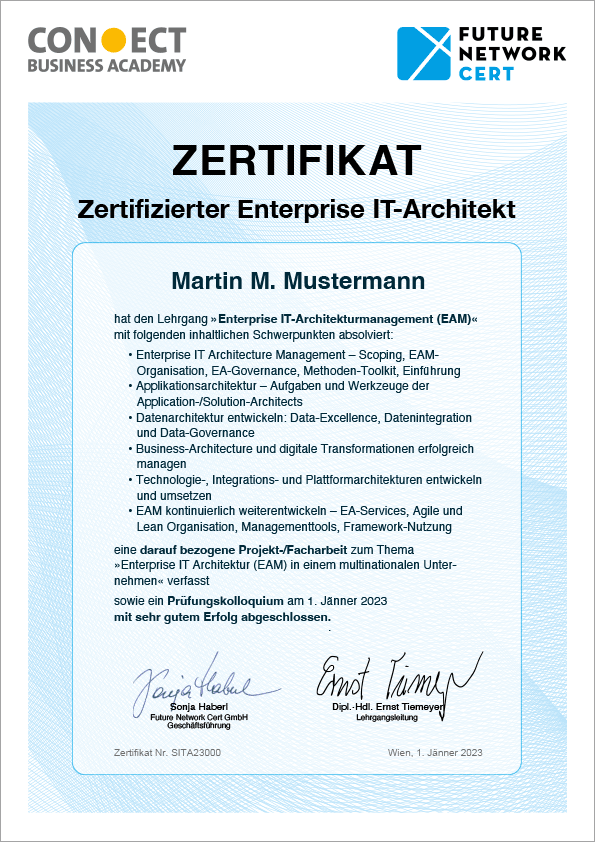 Mit dem Bestehen der (freiwilligen) Prüfung am Ende des Lehrganges erhalten die Teilnehmer das Zertifikat "EAM-Manager". Diese Zertifizierung bietet Ihnen den Nachweis über einen umfassenden, ganzheitlichen Kompetenzerwerb im Bereich Enterprise IT-Architekturmanagement.